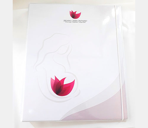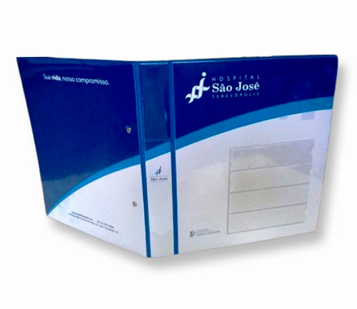 Descrição: As Pastas Fichário Prontuário Médico, são confeccionadas pelo processo de *solda eletrônica, em papelão Paraná, podendo ser revestidas em laminado de PVC (vinil) de diversas cores ou outras matérias primas de maior resistência. Podem ser personalizadas com a logo, a Identificação dos quartos ou sem personalização. (Itens opcionais: Podem conter argolas para fixação dos papéis ou romeu e julieta de plástico ou metal. Também podem ter bolsos ou visores para identificar o paciente ou o leito).