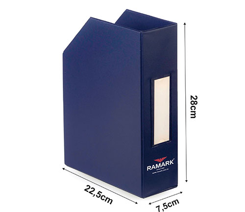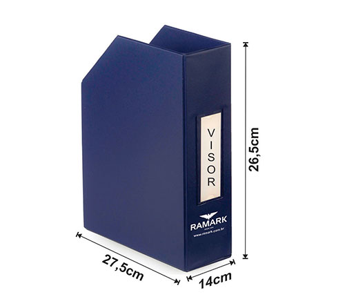 Descrição: Os Porta Revistas são confeccionados pelo processo de *solda eletrônica, em papelão Paraná, revestido em laminado de PVC (vinil) de diversas cores. Podem ter a logomarca da empresa ou os assuntos que utilizam pelo processo de serigrafia (silkscreen), ou auto personalizados através do visor que o acompanha. Práticos, modernos e desmontáveis para facilitar a sua estocagem. Perfeitos para organizar suas revistas, catálogos, livros e documentos. Veja as medidas disponíveis.