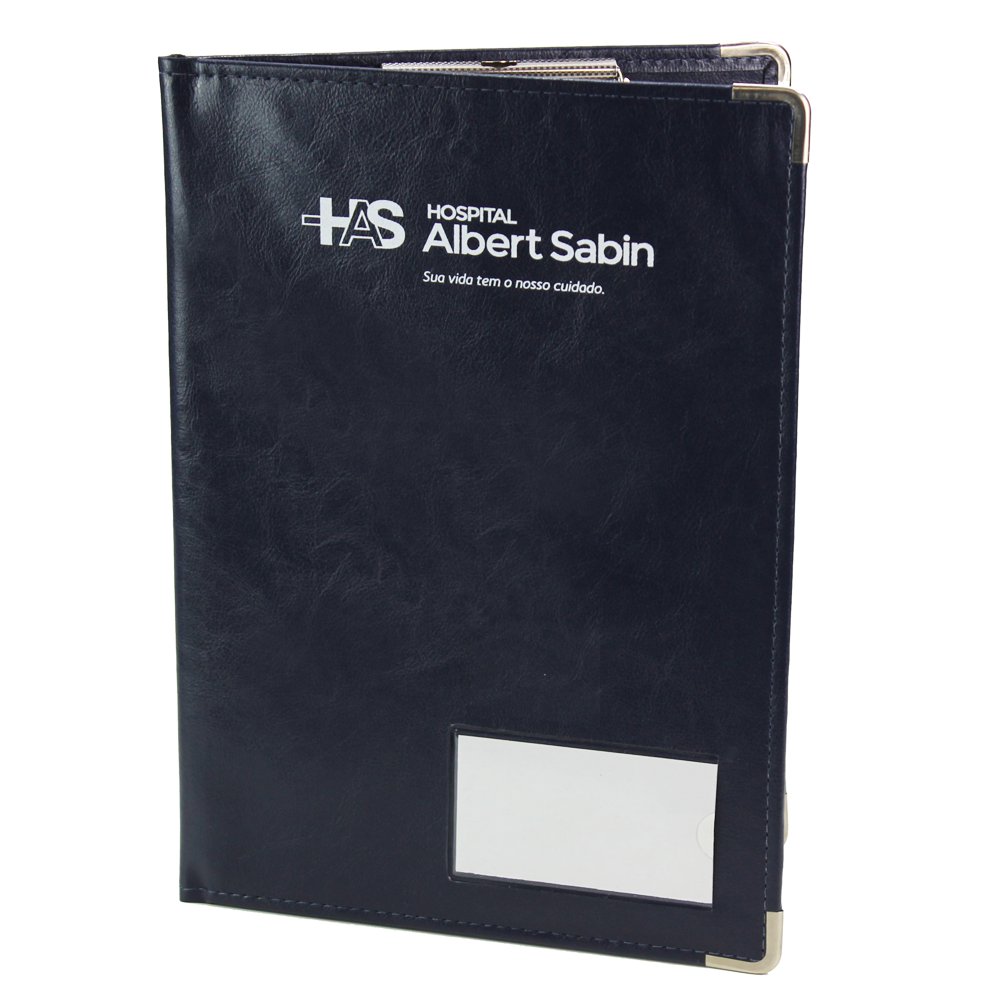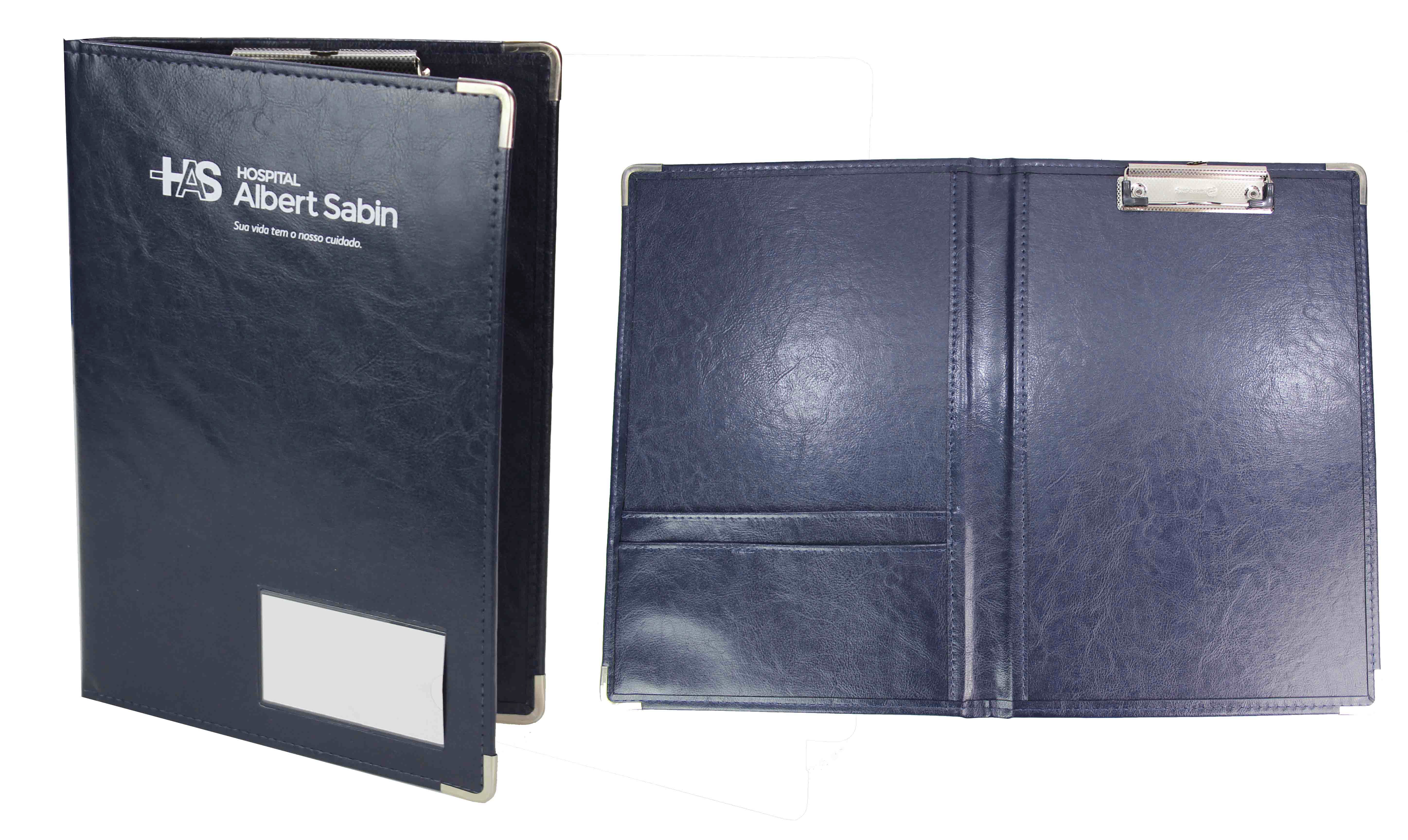 Descrição: As Pranchetas Prontuário Médico, são confeccionadas pelo processo de *costura, em papelão Paraná, podendo ser revestidas com matérias primas de maior resistência, como couro sintético. Podem ser personalizadas com a logo, a Identificação dos quartos ou sem personalização. (Itens opcionais: Podem conter argolas para fixação dos papéis ou romeu e julieta de plástico ou metal. Também podem ter bolsos ou visores para identificar o paciente ou o leito).